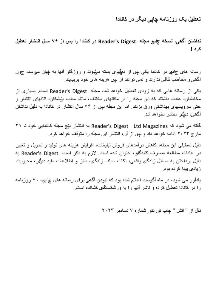 مقاله پیوست نقل از شماره 7 دسامبر 2023 روزنامه ” آتش ” چاپ تورنتو است که روزنامه جامعه ( community ) فارسی زبانان کانادا می باشد. در این مقاله, طبق معمول این نشریه باختصار به این موضوع پرداخته شده که چگونه نسخه چاپی مجله Digest Reader’s در کانادا پس از 76 سال انتشار, بجهت نداشتن آگهی تعطيل میشود.