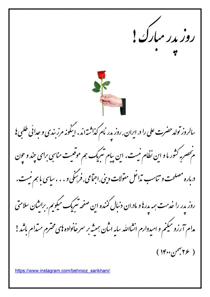 مناسبت هائی همچون روز ” پدر ” ( و مادر ), یادآور زحمات و آمال نیکی است که هر نسل برای فرزندان خود داشته است. این تلاش و آرزوی صدها هزار ساله, بازهم ادامه خواهد یافت و امید و یقین که نسلهای آینده, جهانی بمراتب بهتر برای فرزندان خویش بجای خواهند گذاشت !