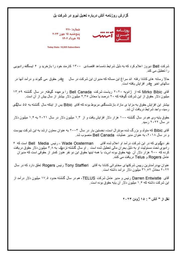 گزارش این روزنامه فارسی زبان چاپ کانادا را بدون کمترین تغییر و با همان ادبیات پیوست است. ” آتش ” برای این گزارش عنوانی غیرجنجالی نیز انتخاب کرده که آنهم بسیار درس آموز و قابل تامل است.